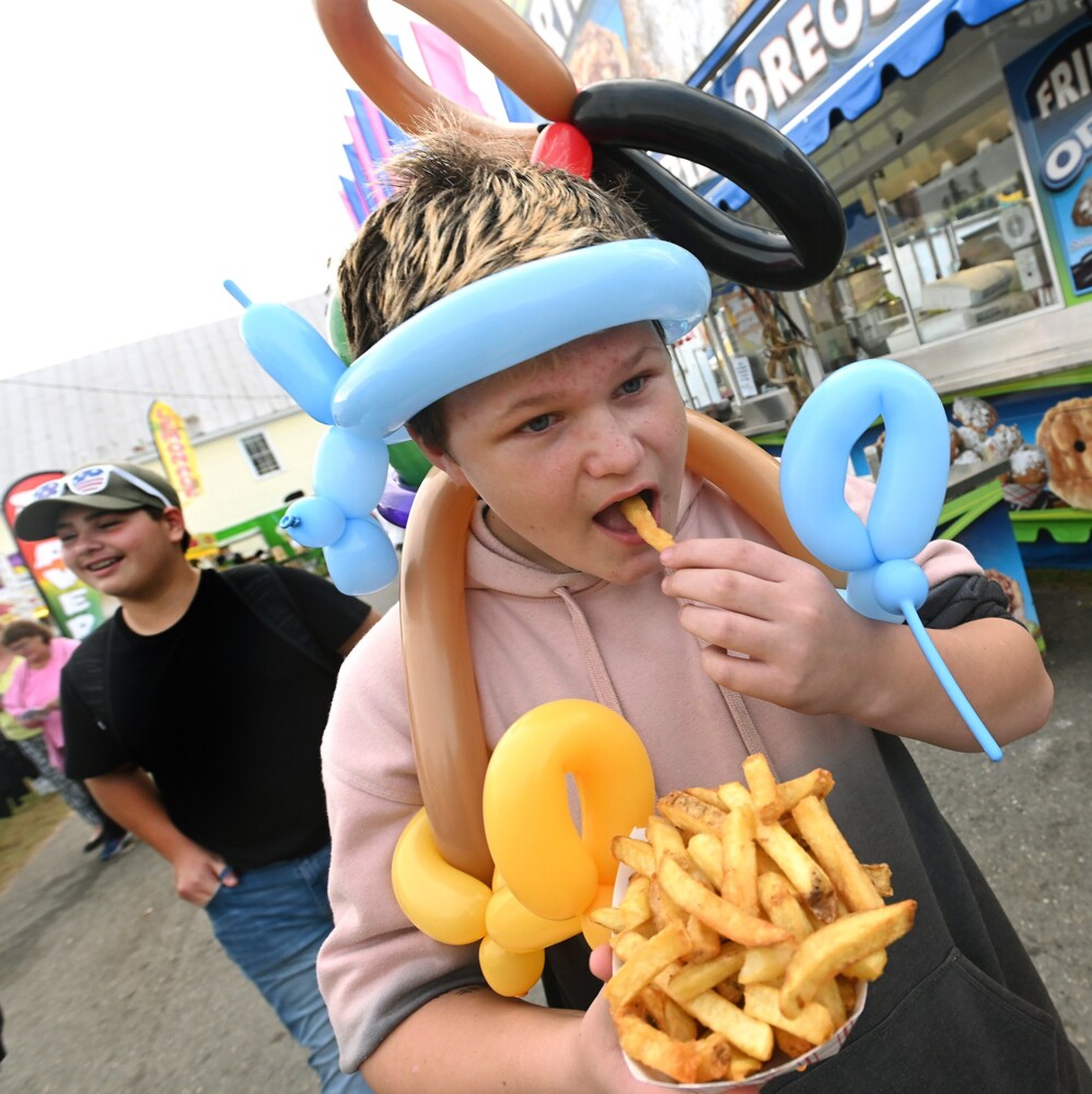 Kendrick Williamson, 13, of Farmington wears balloons and snacks on fries Thursday at the Farmington Fair. The weeklong fair ends Saturday. Rich Abrahamson/Morning Sentinel
