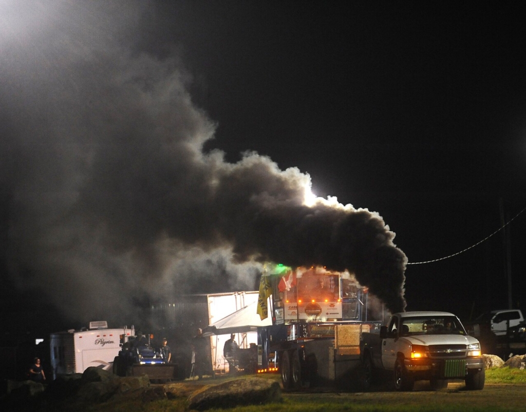 A cloud of exhaust smoke billows as a driver competes in the truck pull Thursday at Farmington Fair. Rich Abrahamson/Morning Sentinel