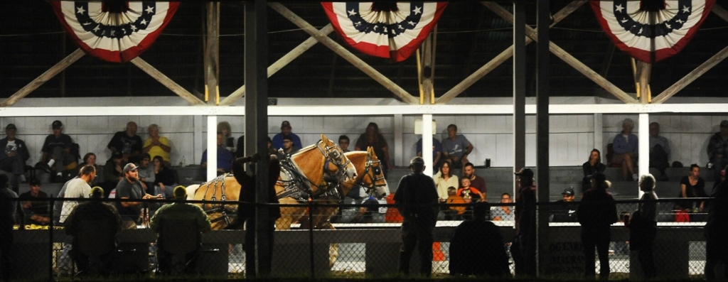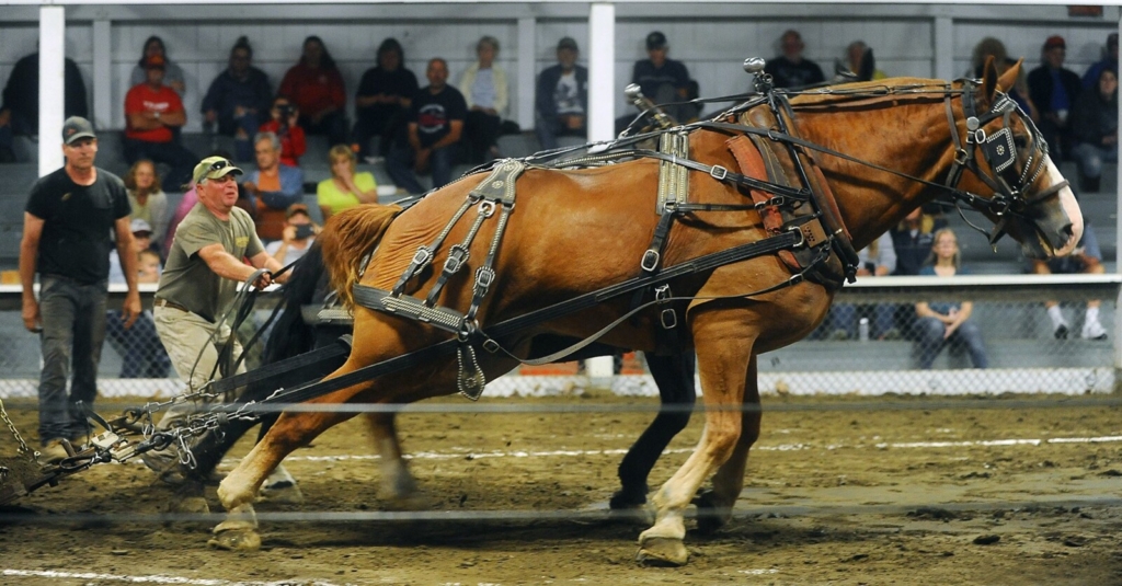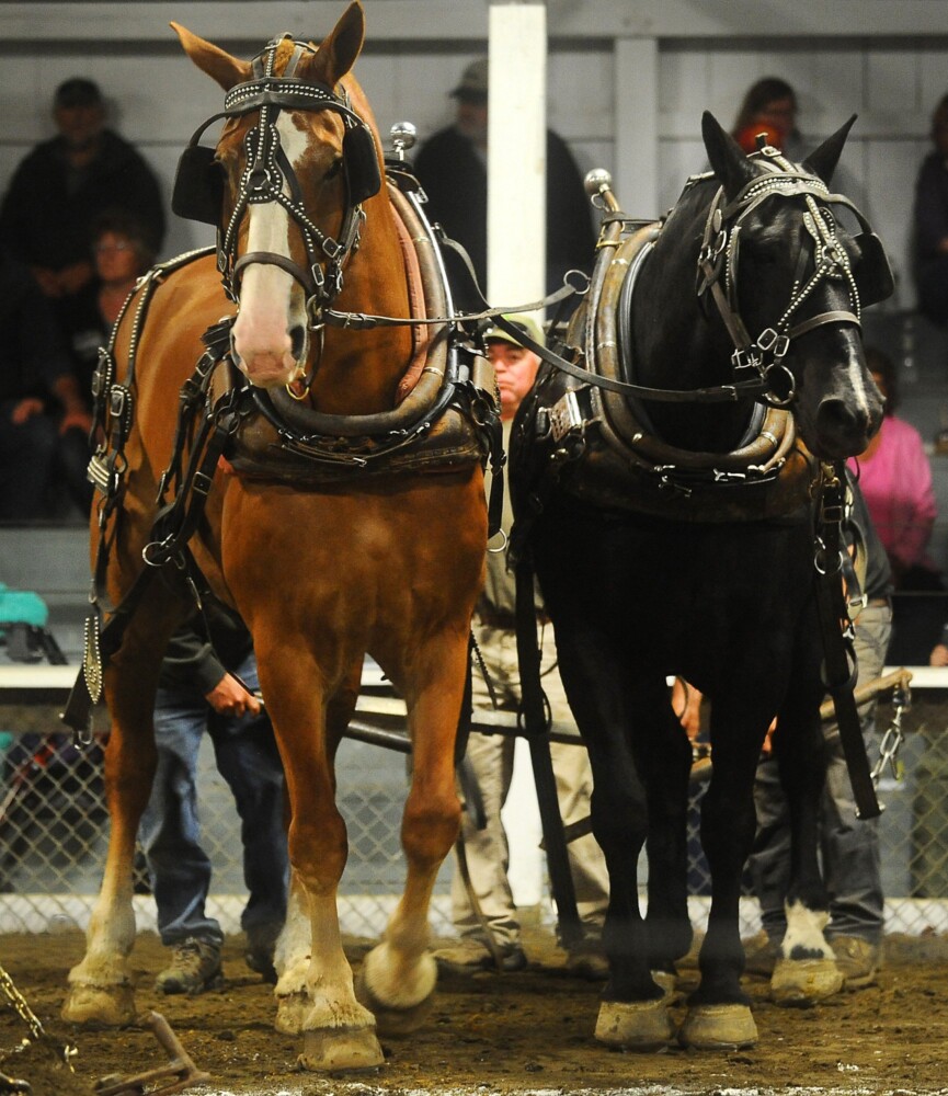 Two horses lean into their pull Thursday during a horse-pulling competition at the Farmington Fair. The weeklong fair ends Saturday. Rich Abrahamson/Morning Sentinel
