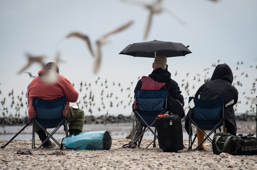 Red knots are elite athletes of the bird world and stop briefly in Delaware Bay in the spring when horseshoe crabs lay eggs, a spectacle that draws birders and researchers. Seated, from left, are Graham Austin, of the British Trust for Ornithology, Feo Pitcairn, an independent nature photographer and filmmaker, and Michael Parr, of the American Bird Conservancy, survey the birds. Andre Chung/Tribune News Service
