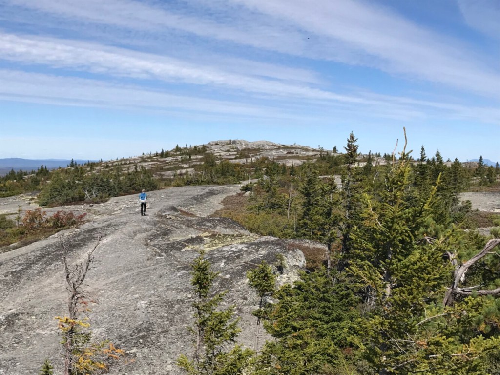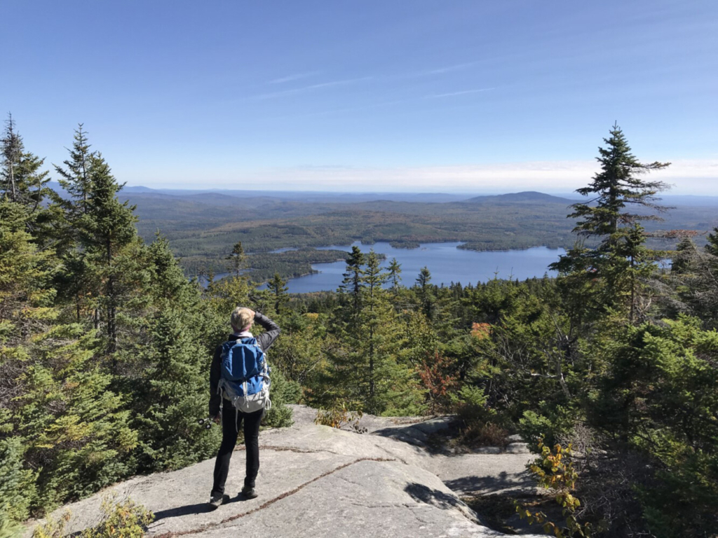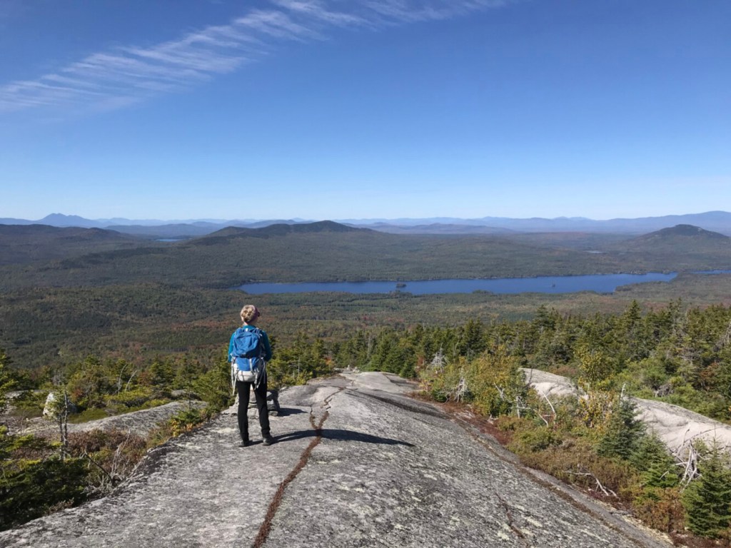 A mile and a half to the north via the AT and a blue-blazed side trail is the 2,350-foot north peak of Moxie Bald Mountain, a lightly visited gem that features even more open bedrock terrain. You’re likely to have the place to yourself while you enjoy the view that ranges from the High Peaks Region and the Canadian border around Jackman to Moosehead Lake and across the 100-Mile Wilderness to Katahdin.