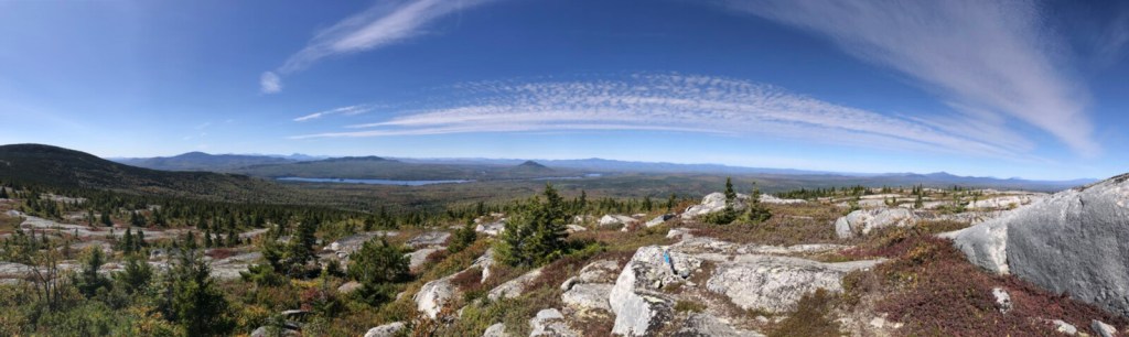 The view north from Moxie Bald Mountain’s summit ledges extends over the 100-Mile Wilderness to Katahdin. Photo by Carey Kish