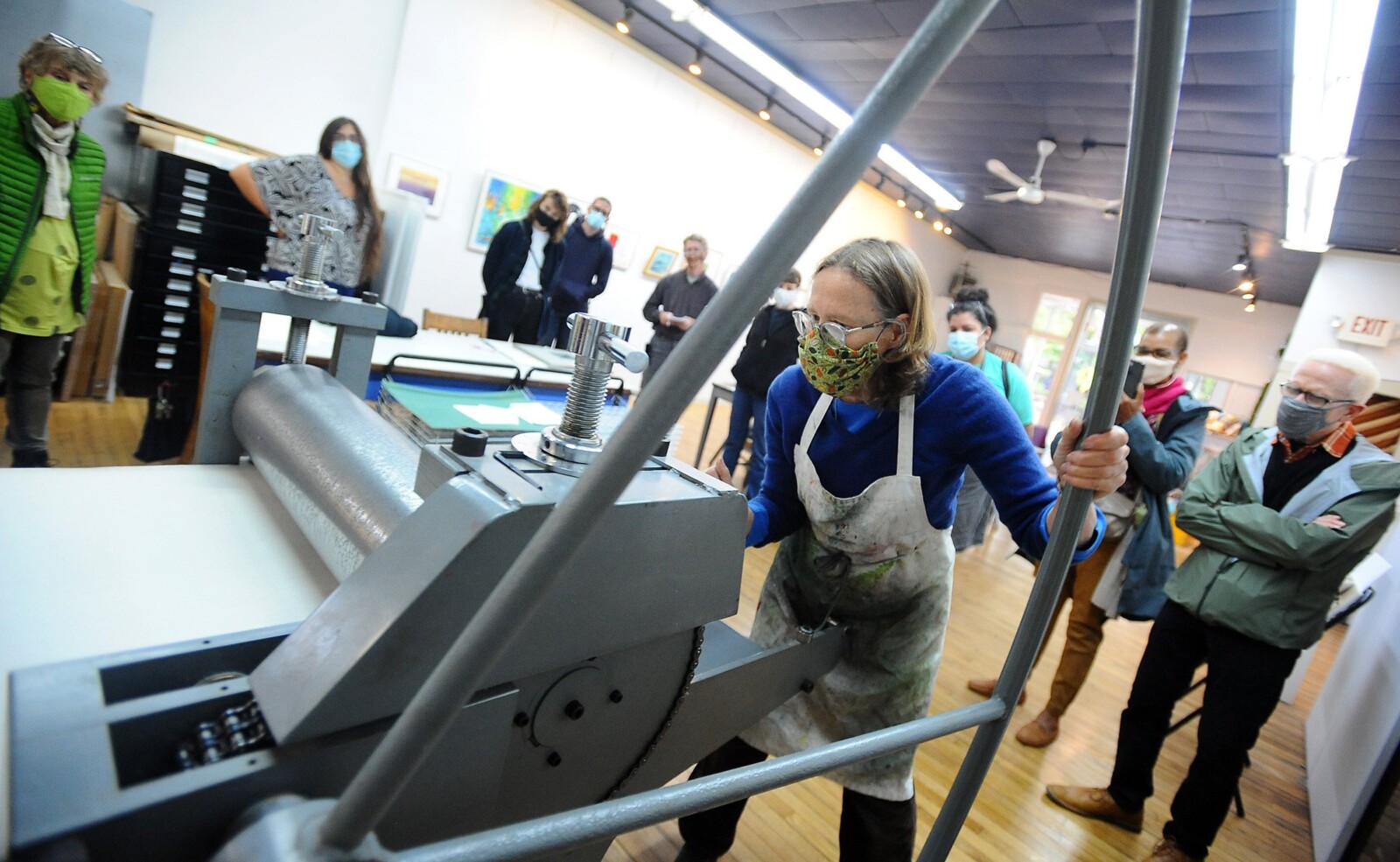 Rebecca Goodale turns the wheel of a press Sunday while demonstrating relief print making during Maine Craft Weekend at Circling the Square Fine Art Press on Water Street in downtown Gardiner Rich Abrahamson/Morning Sentinel
