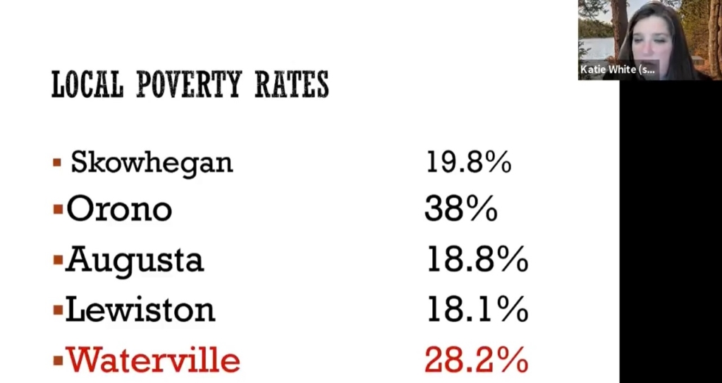 Katie Spencer White, CEO of the Mid-Maine Homeless Shelter in Waterville, speaks Wednesday night during the first of three virtual forums open to the public about homelessness. In this slide, White points out how Waterville has the second-highest poverty rate in Maine, at 28.2%, based on federal poverty guidelines. Facebook screenshot