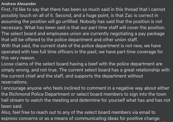 Selectboard member Andrew Alexander responded to Kindelan’s post, calling it a “loose claim” that the sitting Selectboard and the Richmond Police Department have “a beef” and that it is “not true.”