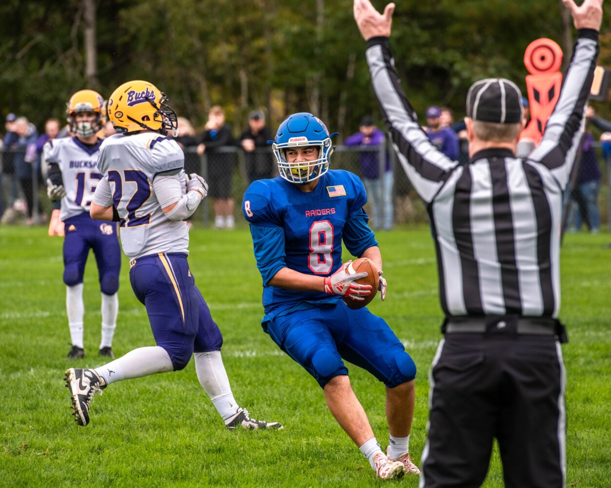It’s the same story on defense, where in the last game against Bucksport, Thompson went for a tackle, ripped the ball from the Bucksport player’s hands, and ran 83 yards for a touchdown, one of three scores of more than 50 yards he’s had on offense and defense this season.