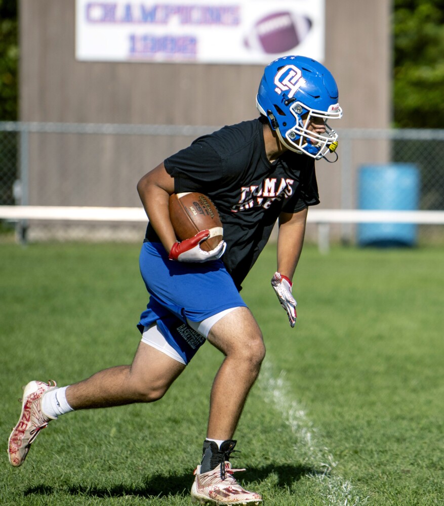 Oak Hill’s Caden Thompson runs the ball during a football practice Thursday in Wales. Joe Phelan/Kennebec Journal