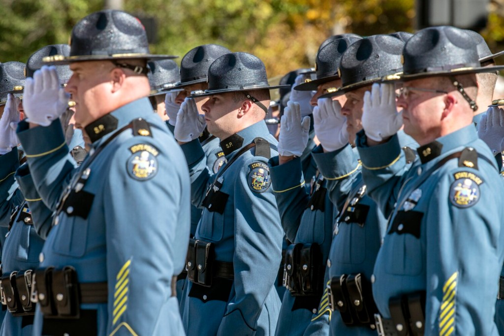 Dozens of Maine State Police troopers and other law enforcement officers took part in the memorial ceremony, standing in rows in the back behind spectators in chairs in the middle of a closed section of State Street near the Maine State House.