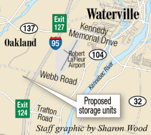 The storage units being developed by Dennis Brockway would be close to the Oakland town line on Webb Road, adjacent to a former landfill site. The development requires the council to approve rezoning the property from rural residential to one allowing some commercial development. The Planning Board may recommend rezoning but has no authority to make the change — only the council can do that.