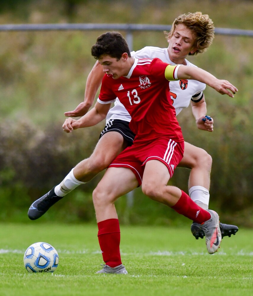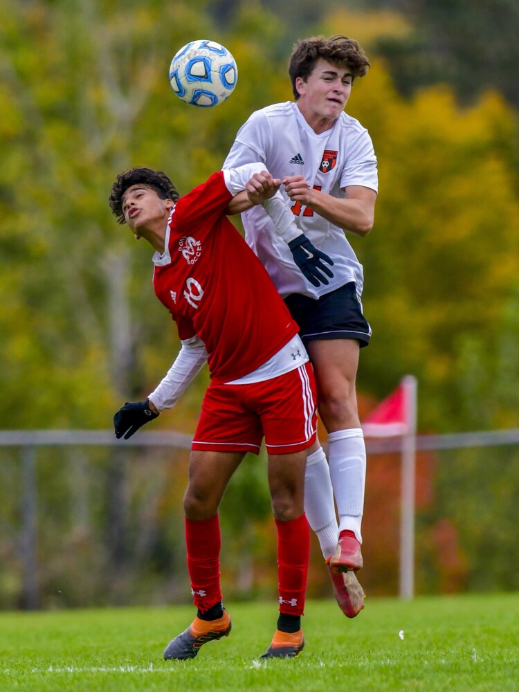 Cony sophomore Yousif Ibrahim, left, and Gardiner sophomore Grayson Allumbaugh make contact as they go for the ball during a Kennebec Valley Athletic Conference Class B game Friday in Augusta. Joe Phelan/Kennebec Journal