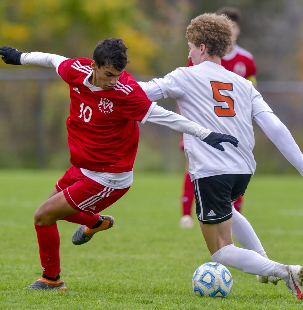 Cony evened the game up just under nine minutes later, with Albadri getting the ball out in front and firing a shot that was blocked by the Tigers’ Caleb Gardner. The ball kicked right back to Albadri, however, and the Cony senior shot again on net as he was falling to the ground and this time found twine.
