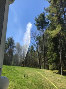 Cotey Green, a certified Maine arborist who works for Bartlett Tree Experts, sprays an application to suppress browntail moth caterpillars on a red oak tree in Waterville recently. Photo courtesy of Bartlett Tree Experts
