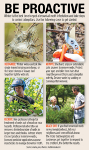 In Waterville, browntail moth caterpillars became more noticeable this past spring. Daly reported several Public Works employees developed rashes from working in the city’s parks and ballfields, and from trimming greenery on roadsides. The moths typically infest oak, pear and apple trees, but also will eat birch, maple and other hardwoods and shrubs when preferred sources have been defoliated, according to Klepach, the city councilor.