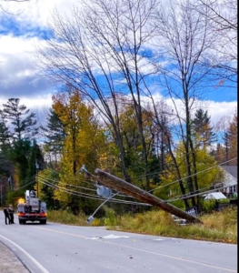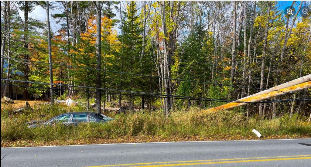 A car driven by Michelle Menner, 50, of Industry went off Industry Road on Sunday and toppled two utility poles that were side by side. Industry Fire and Rescue photo