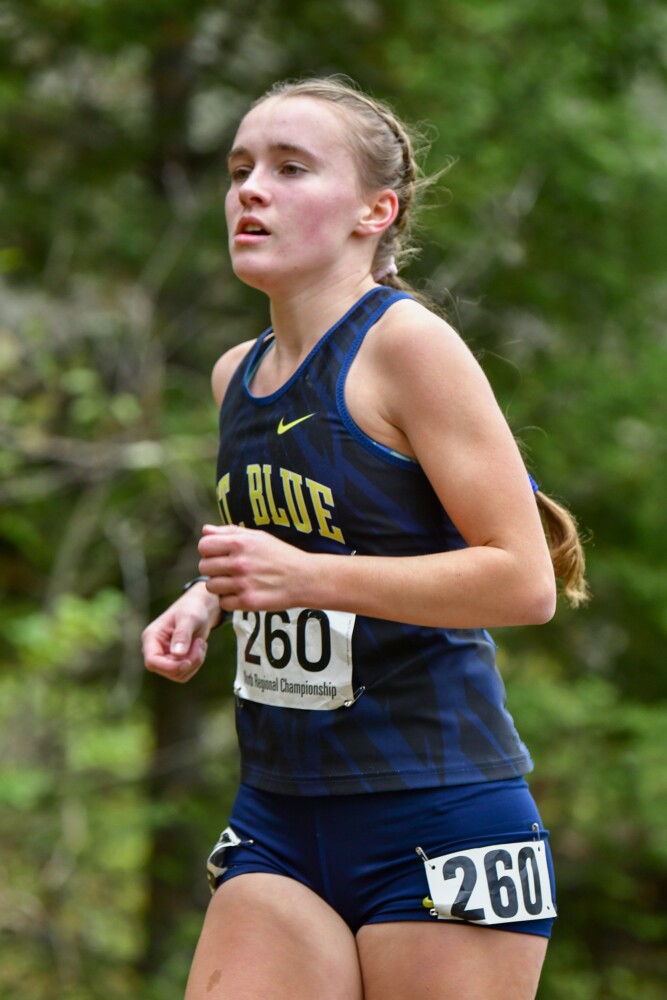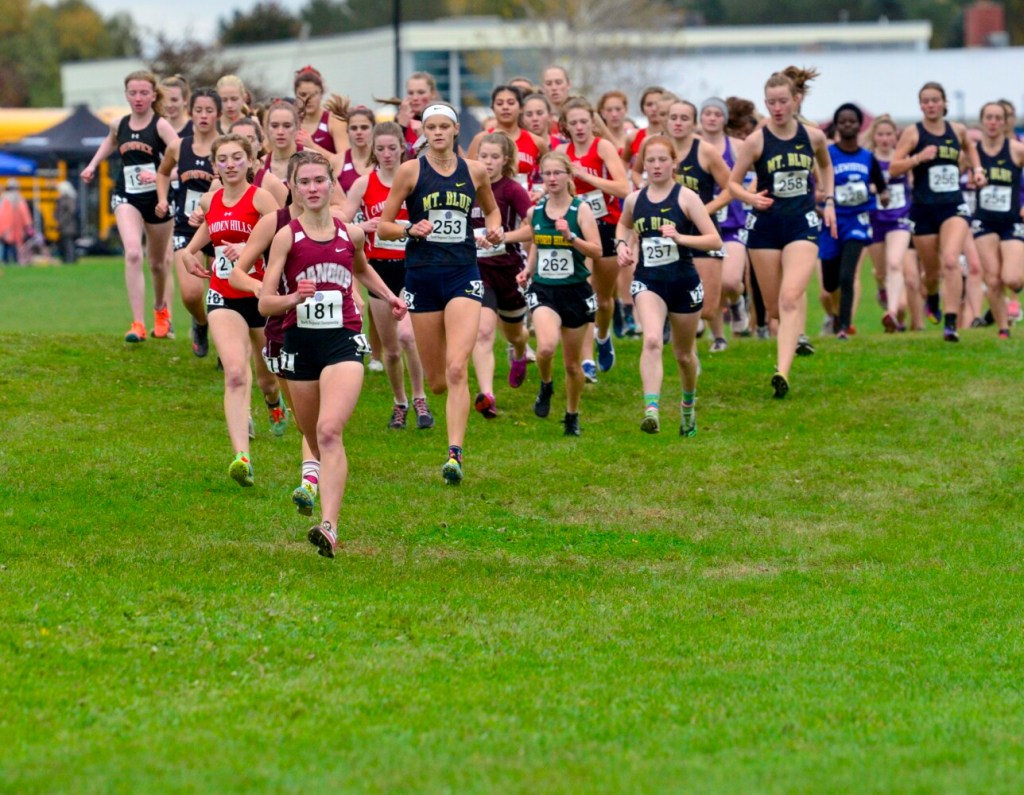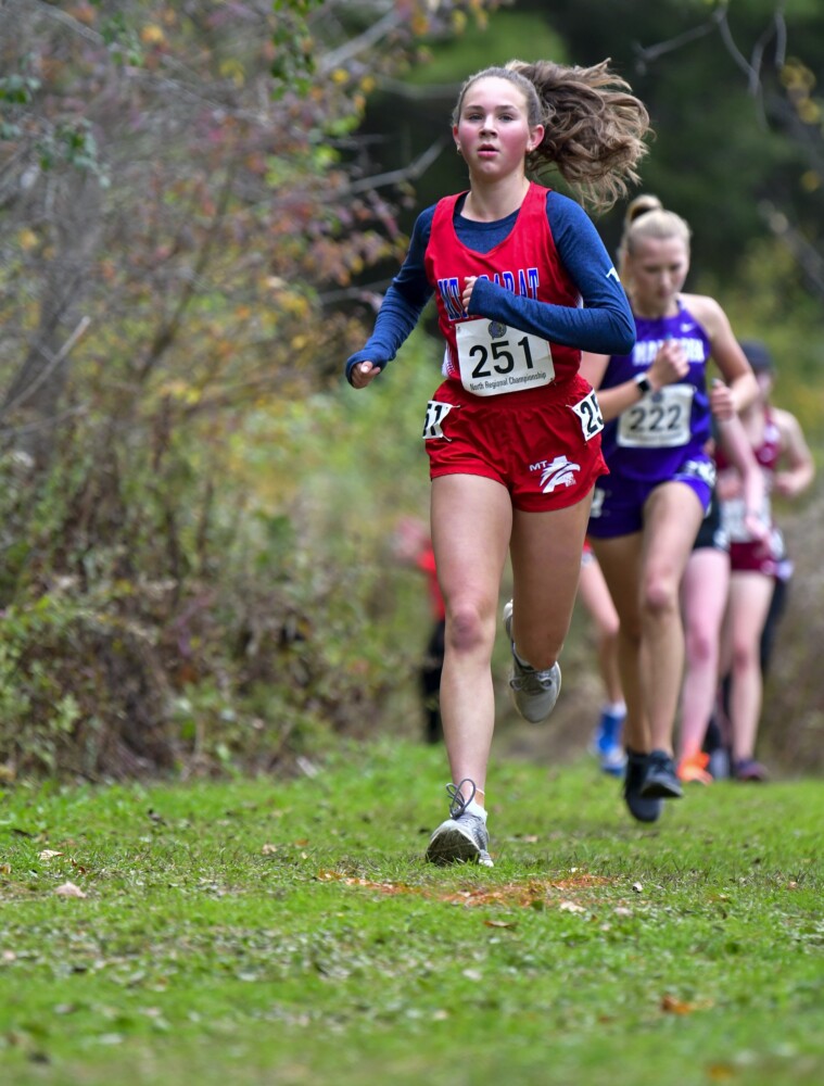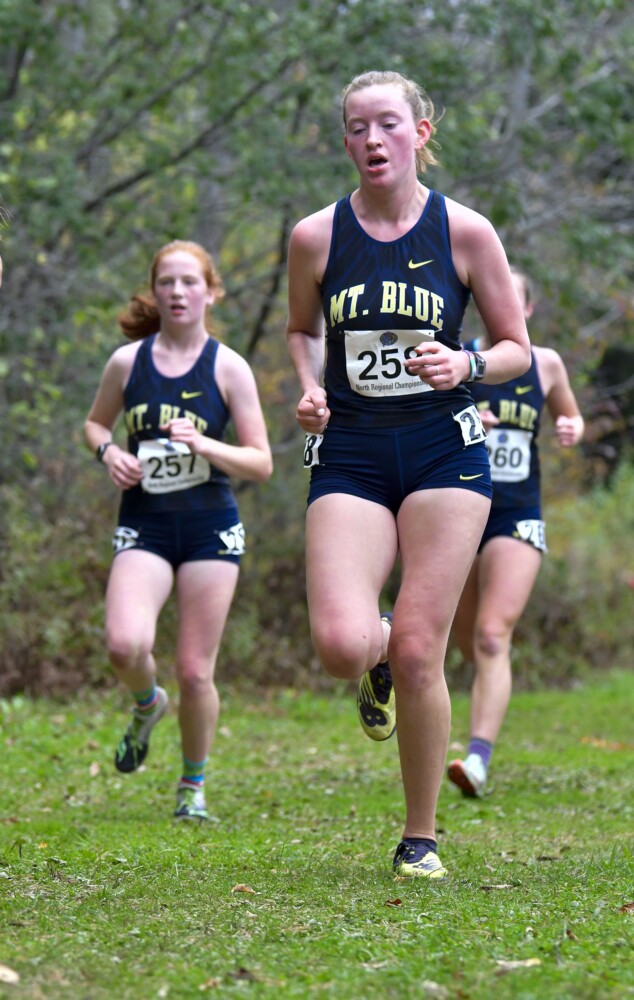 “I can’t even tell you how proud I am,” Mt. Blue head coach Kelley Cullenberg said. “We knew that we had our work cut out for us after last week. I think there’s a lot that didn’t happen last week that could have. But the whole talk of the week was, ‘You guys are the underdogs, and that’s great. People aren’t going to be looking at you like they would have had you done better.’ I think it just relieved some stress… Our No. 2, 3 and 4 girls have been doing workouts together the whole entire time, so it’s really great to see them racing all but the last final stretch together.”