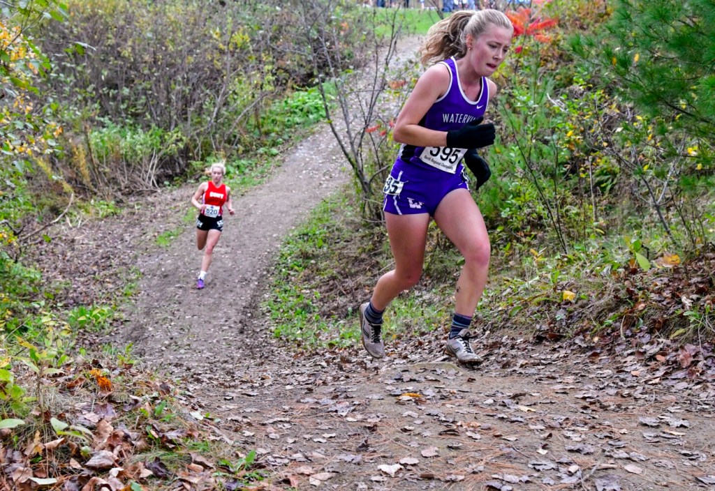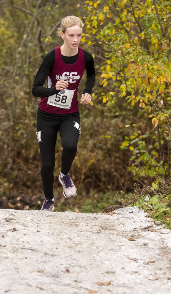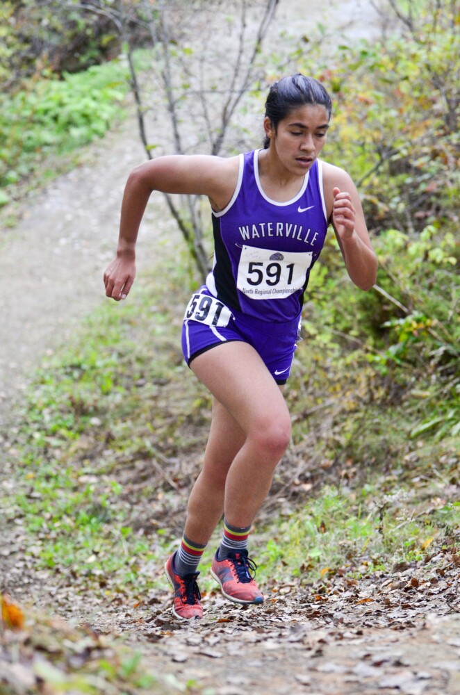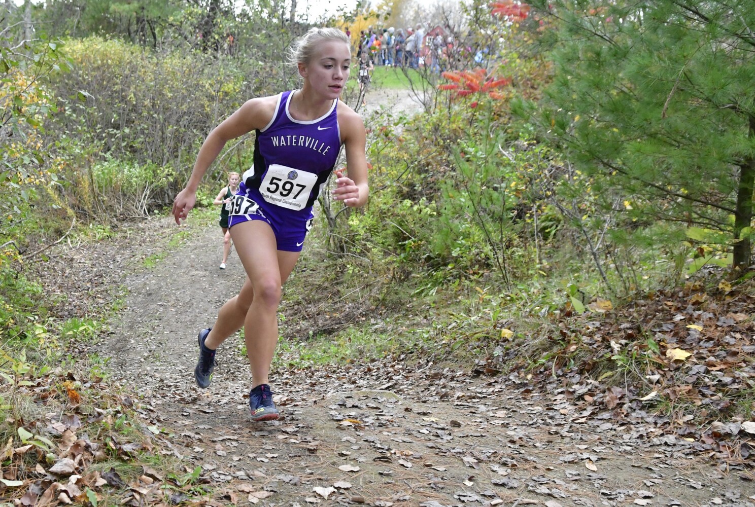 Waterville’s Abby Williams, who finished second, runs up a hill during the girls cross country North regionals Saturday in Belfast. Joe Phelan/Kennebec Journal