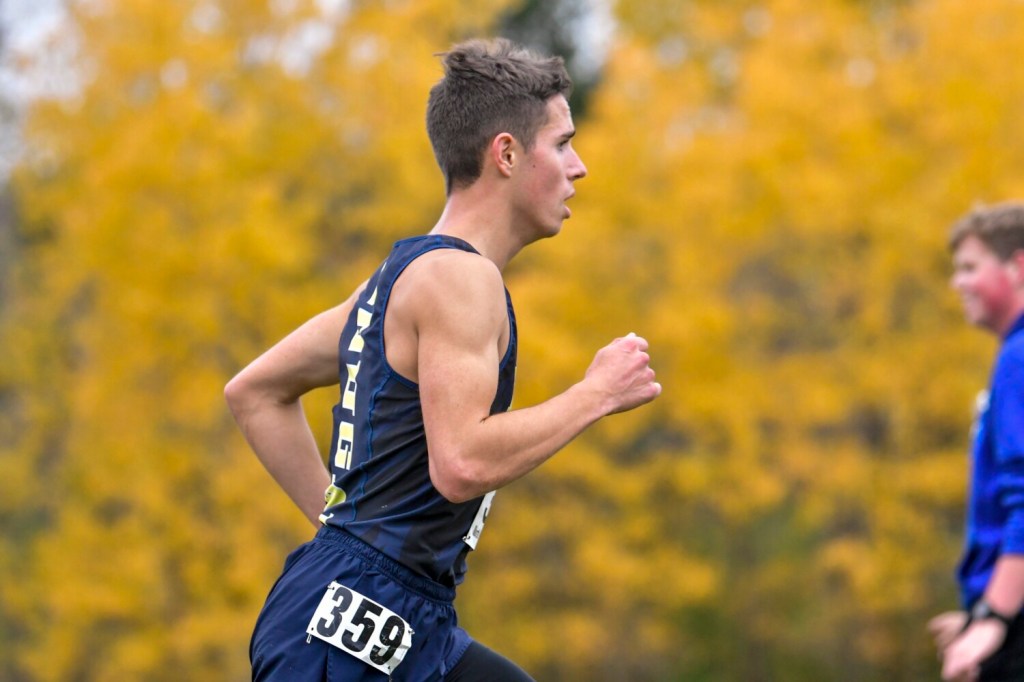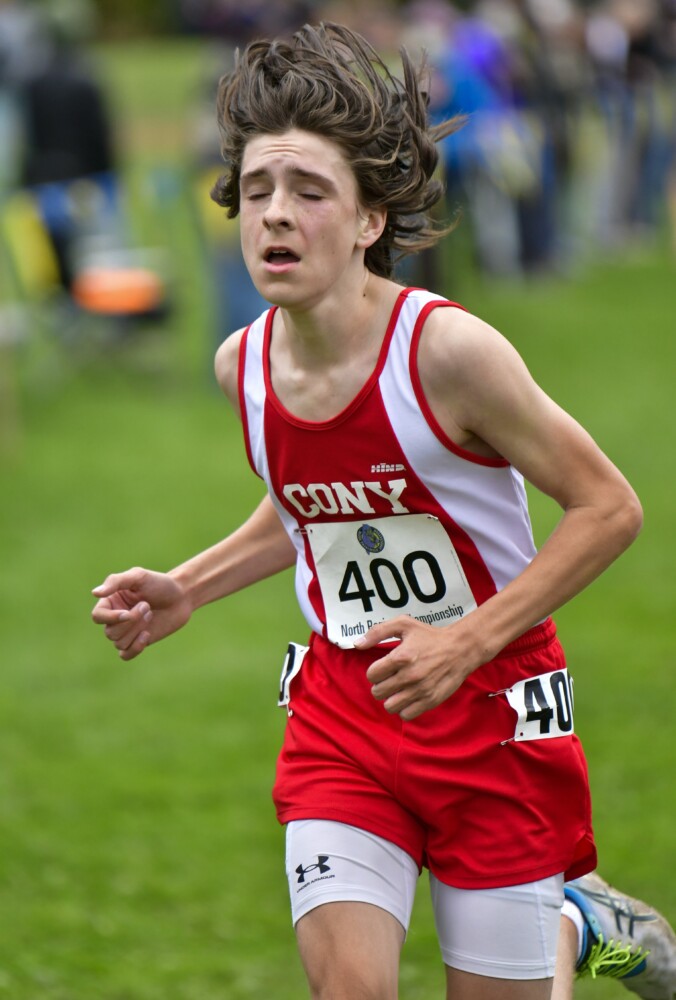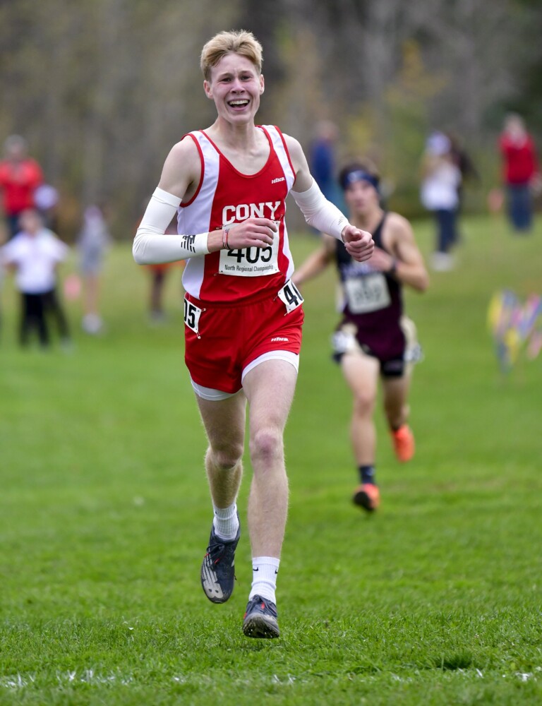 Cony’s Jacob Pelletier crosses the finish line during the boys cross country North regionals Saturday in Belfast. Joe Phelan/Kennebec Journal