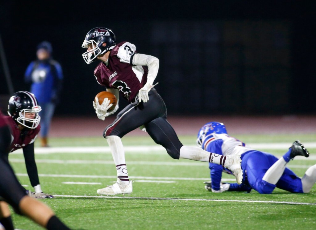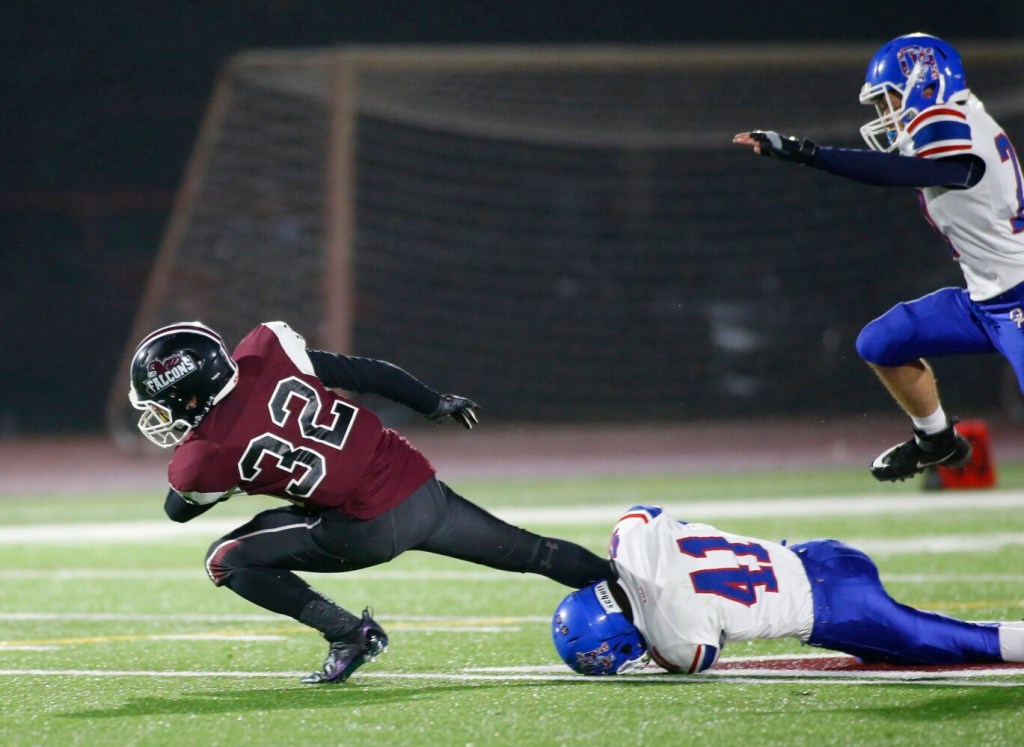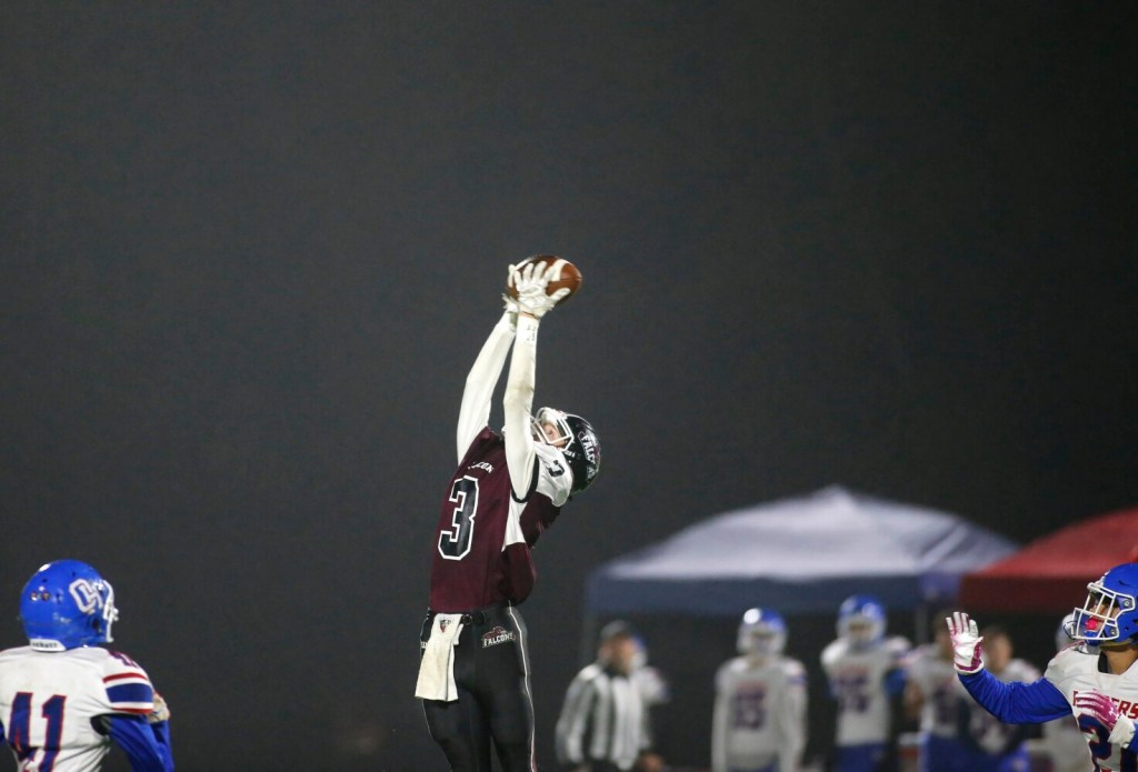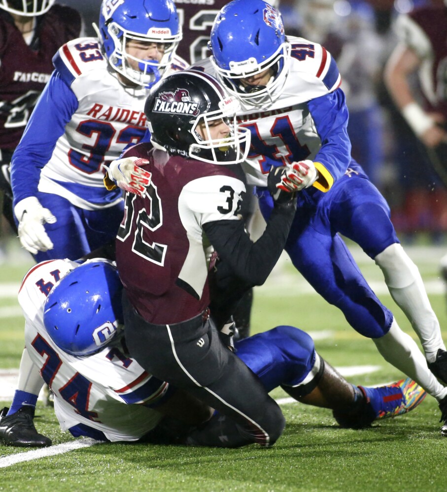 On the ensuing Raiders’ drive, Casale picked off Arbour again. He took it back to the 5-yard line, setting up a touchdown run for Jordan Knighton, who led the Falcons with 118 rushing yards on 13 carries. He scored three times, coming on runs of 5, 39 and 26 yards.