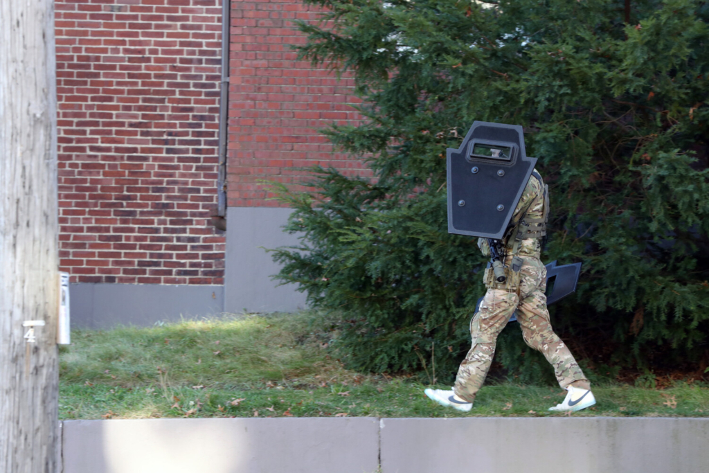 A police officer carries two ballistic shields into 62 State St. on Sunday. Ben McCanna/Staff Photographer
