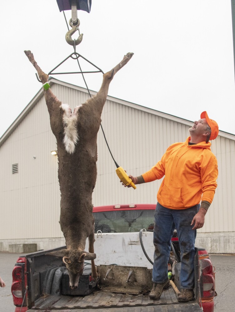 David Larrabee of South China tagged a doe at Hussey’s, one of two deer he encountered in the woods that morning. He said he hunts every year, but enjoyed it more when relatives he used to hunt with were still alive to join him. A few other hunters, spotting the deer in the back of his truck, ambled over to check it out.