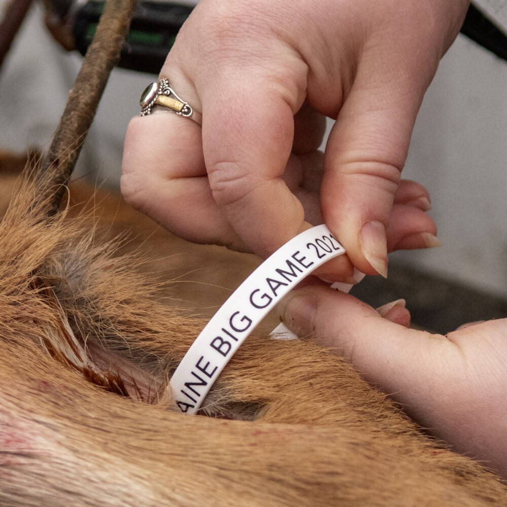 A store employee clips a Maine Big Game tag onto a deer’s leg Saturday at Tobey’s Store in China. Saturday was opening day of deer hunting for Mainers using firearms. Joe Phelan/Kennebec Journal