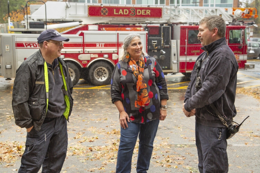 Carol Schiller, founder of Portland’s University Neighborhood Organization, talks Saturday with Gorham fire inspector Charles Jarrett and Portland Fire Department Advanced EMT Jeff Goodness during the organization’s annual Halloween fire prevention festival at the University of Southern Maine in Gorham. That event is meant to bring the community together to celebrate and to share safety information that could prevent future heartbreak. Carl D. Walsh/Staff Photographer