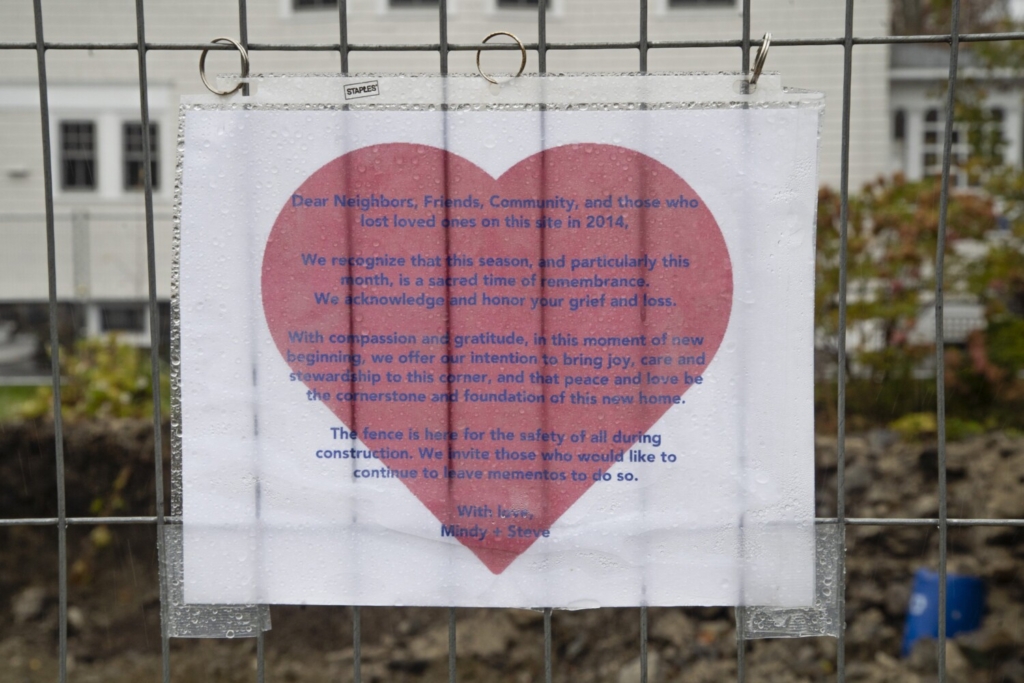 In years past, people left carved pumpkins and painted rocks on the foundation inside the property line, especially around the anniversary of the fire. On the new construction fence, the couple have posted a sign that invites people to continue to leave such mementos.
