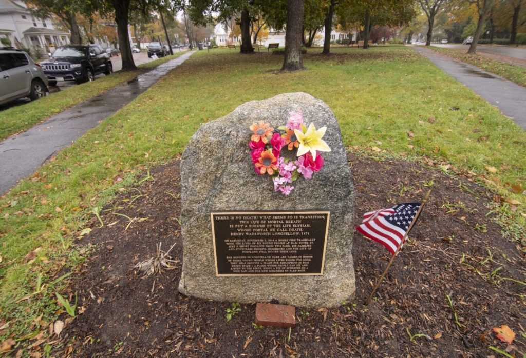 In 2019, at the public urging of Lisa LeConte Mazziotti, whose daughter Nicole Finlay died in the fire, the city installed a memorial at nearby Longfellow Park on Noyes Street. A granite marker bears a bronze plaque that pays tribute to the lives lost. A bouquet of fresh purple and yellow flowers rested on the stone Monday. Each of the six benches that were placed there is dedicated to one of the victims.