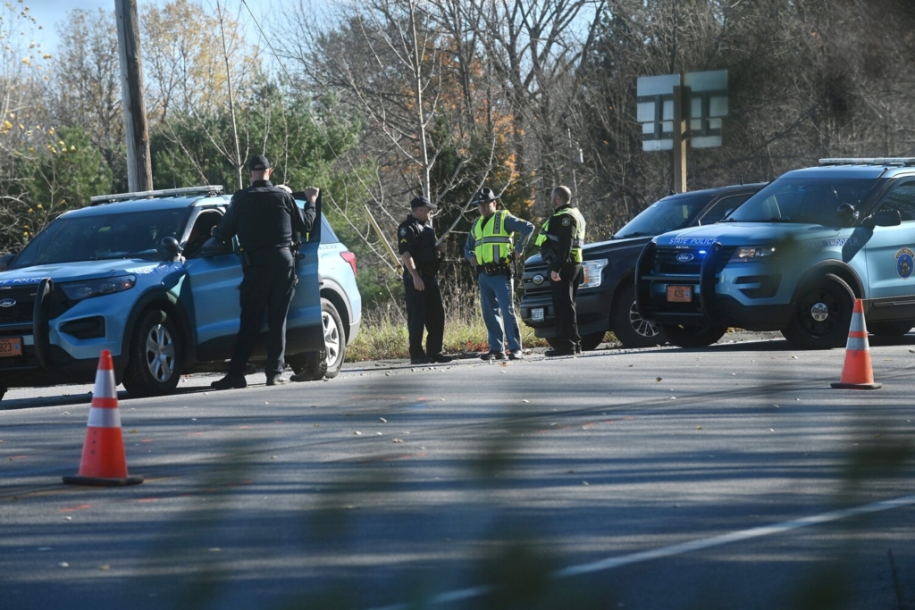 Law enforcement officers manage a roadblock Monday where a collision occurred at the intersection of Route 139 and Route 104 in Fairfield. Rich Abrahamson/Morning Sentinel