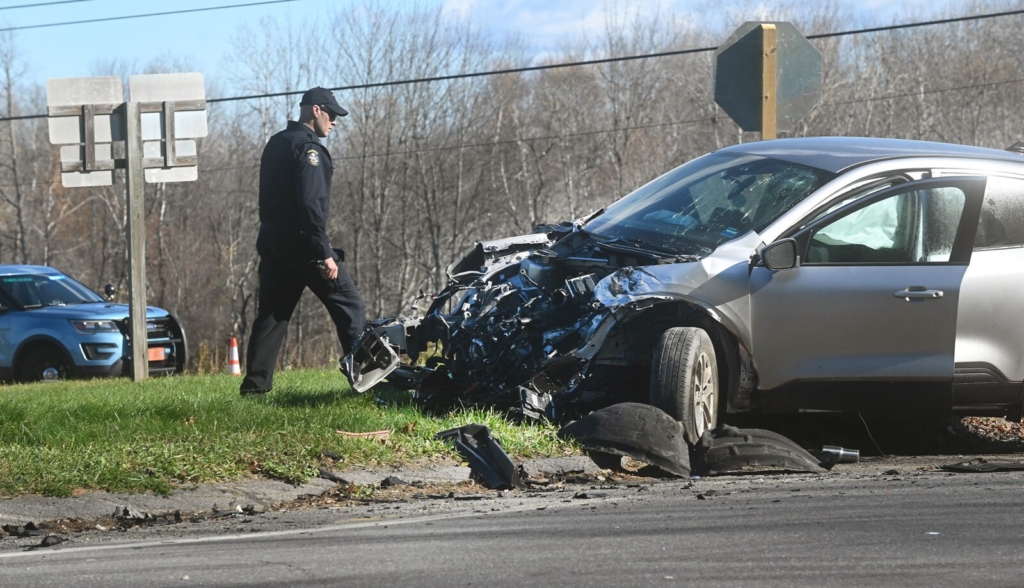 A police officer walks past a car that sustained extensive front-end damage in a three-vehicle collision Monday at the intersection of Route 139 and Route 104 in Fairfield. Rich Abrahamson/Morning Sentinel