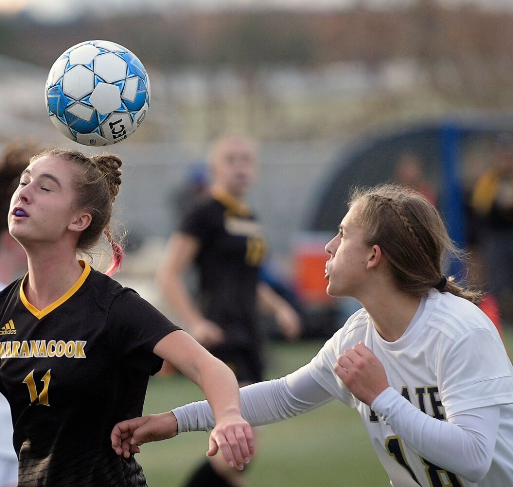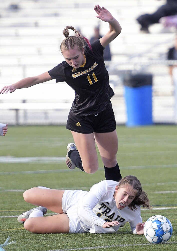 Maranacook’s Emily Harper, left, knocks the ball away Traip Academy’s Noelle Denholm during the Class C South girls soccer regional final Tuesday in Lewiston. Andy Molloy/Kennebec Journal
