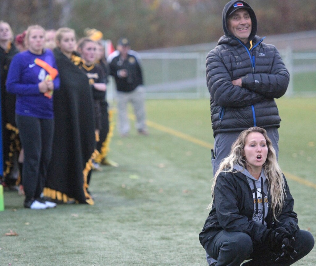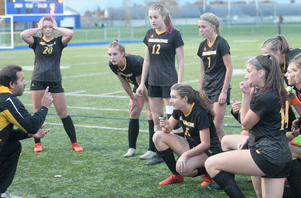 Maranacook coach Travis Magnusson, left, speaks to his team in the final moments of a game against Traip Academy in the Class C South girls soccer regional final Tuesday in Lewiston. Andy Molloy/Kennebec Journal