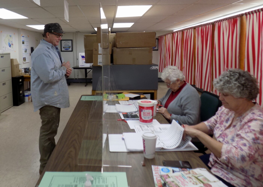 Wilton resident Colby Ryder waits while ballot clerks Carolyn Smith and Lyn Lewia at right check their voter lists. Pam Harnden/Livermore Falls Advertiser
