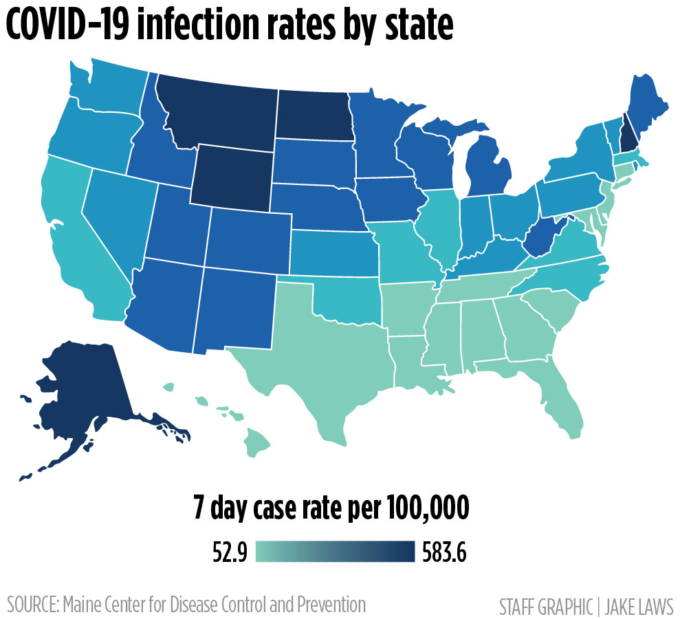 Maine had the 18th-highest rate of COVID-19 cases in the nation Friday, with 35 cases per 100,000 population on a seven-day rolling average, according to the Harvard Global Health Institute. The national average is 22 cases per 100,000. New Hampshire and Vermont also have infection rates well above the national average.