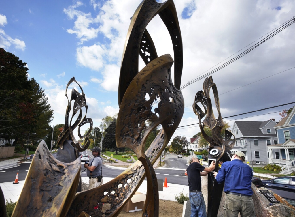 At 3:30 p.m. Monday, the public art committee will cut the ribbon on the installation “Passing the Torch” by artist Mark Pettegrow at the new Deering’s Corner Roundabout, near the University of Southern Maine at the intersection of Brighton and Deering avenues and Falmouth Street. The piece, which the committee commissioned in 2019 and with a budget of $123,000, includes three bronze flames that are between 8 and 12 feet tall rising from boulders of Maine granite atop the roundabout.