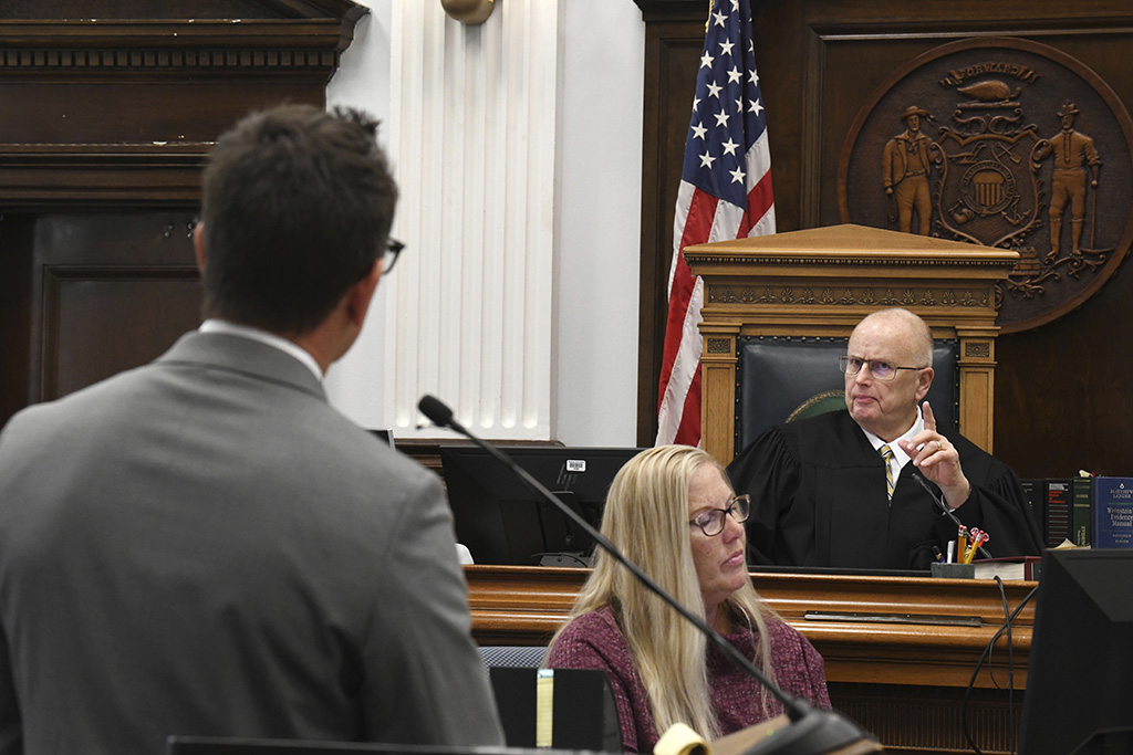 Assistant District Attorney Thomas Binger is admonished by Circuit Court Judge Bruce Schroeder during Kyle Rittenhouse’s trial at the Kenosha County Courthouse in Kenosha, Wis., on Wednesday. Mark Hertzberg /pool photo via AP