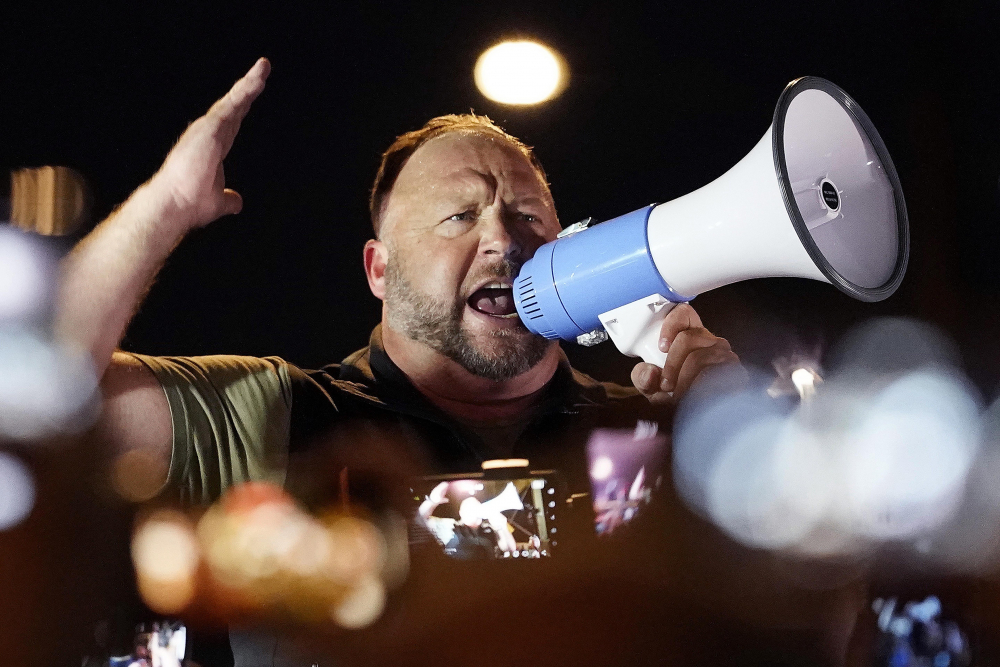 Radio host Alex Jones rallies pro Trump supporters outside the Maricopa County Recorder’s Office, in Phoenix in November 2020. AP Photo/Matt York, File)