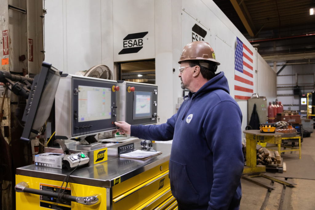 Shipfitter Mark Lancaster, who has worked at BIW for more than 35 years, was chosen to activate the burning machine that was used to cut the first steel for the guided missile destroyer that has been named for Capt. Quentin R. Walsh, a Coast Guard officer who earned the Navy Cross during World War II.