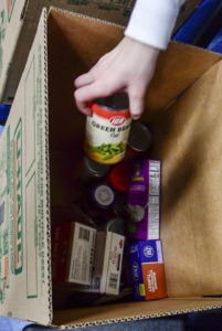 Lily Diversi puts a can of green beans into a Thanksgiving food box Friday in the Little Theater at Gardiner Area High School. Joe Phelan/Kennebec Journal