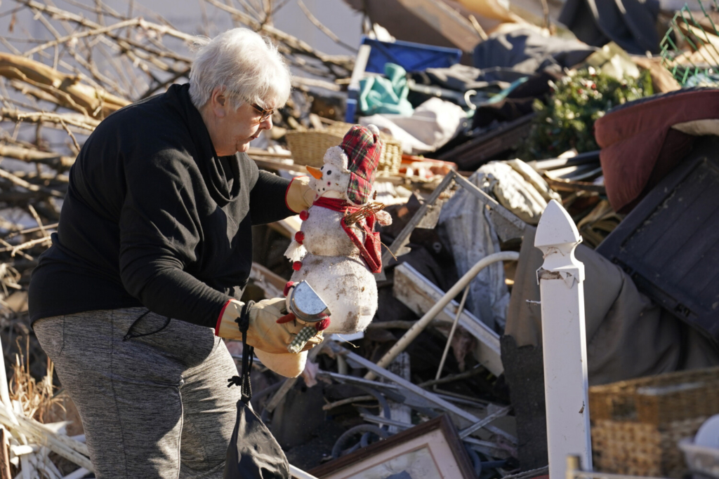 Martha Thomas salvages Christmas decorations from her destroyed home in the aftermath of tornadoes that tore through the region, in Mayfield, Ky., on Monday. Gerald Herbert/Associated Press