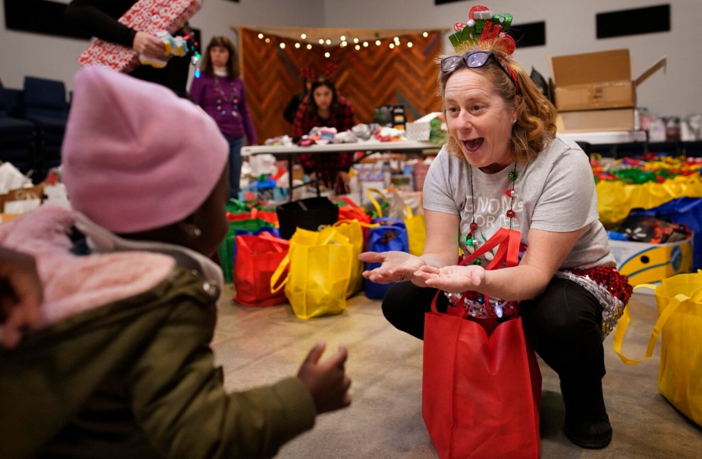 Michelle Sandman greets a child of an immigrant family during the Christmas event Dec. 18 at Eastpoint Church in South Portland. Gregory Rec/Staff Photographer