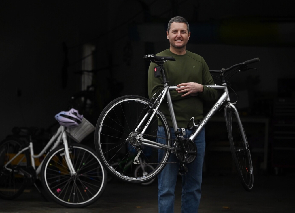 Joshua Fox, an entrepreneur who designed a bicycle taillight called Survue that uses AI to keep riders safe, holds his bicycle with the light on the seat post. Shawn Patrick Ouellette/Staff Photographer