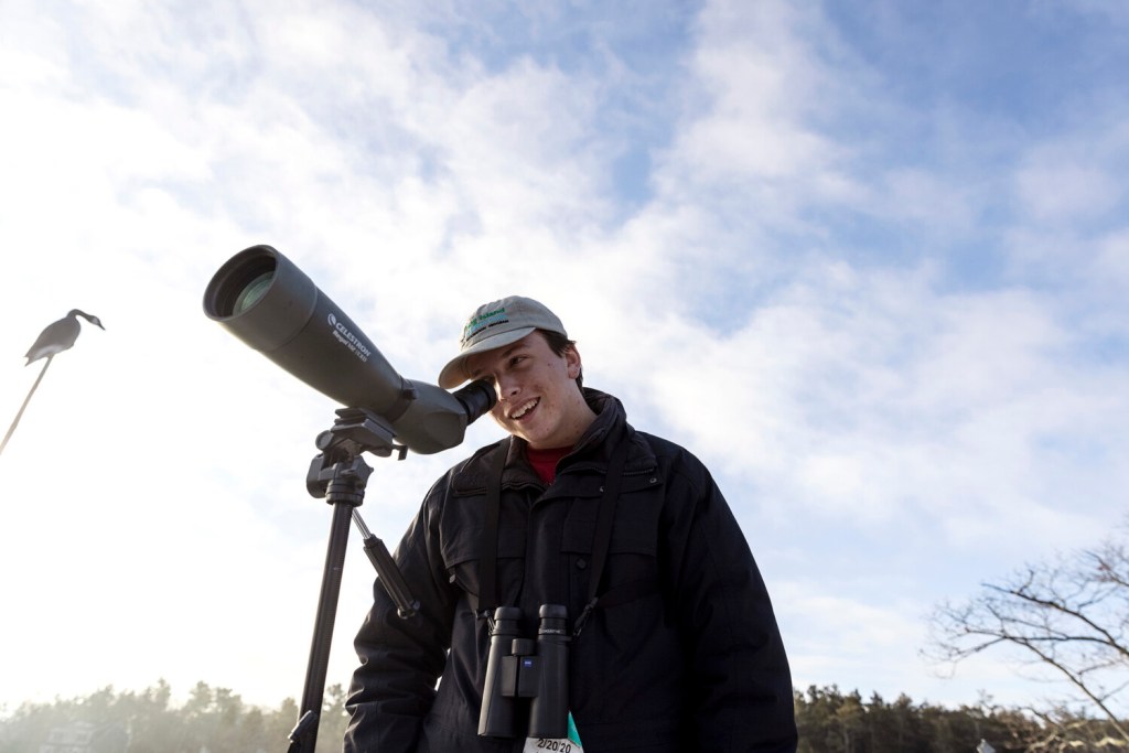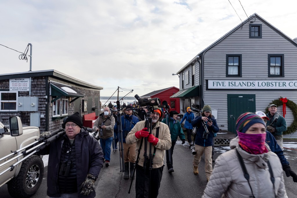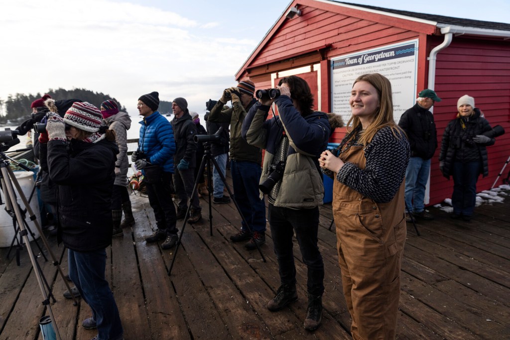 GEORGETOWN — As Chris Sayers picked up his tripod from the pier at Five Islands Harbor to head back to Boston on Friday morning, the bird biologist said goodbye to Maine Audubon naturalist Doug Hitchcox and asked if the Audubon chapter was having a New Year’s Eve party this year.