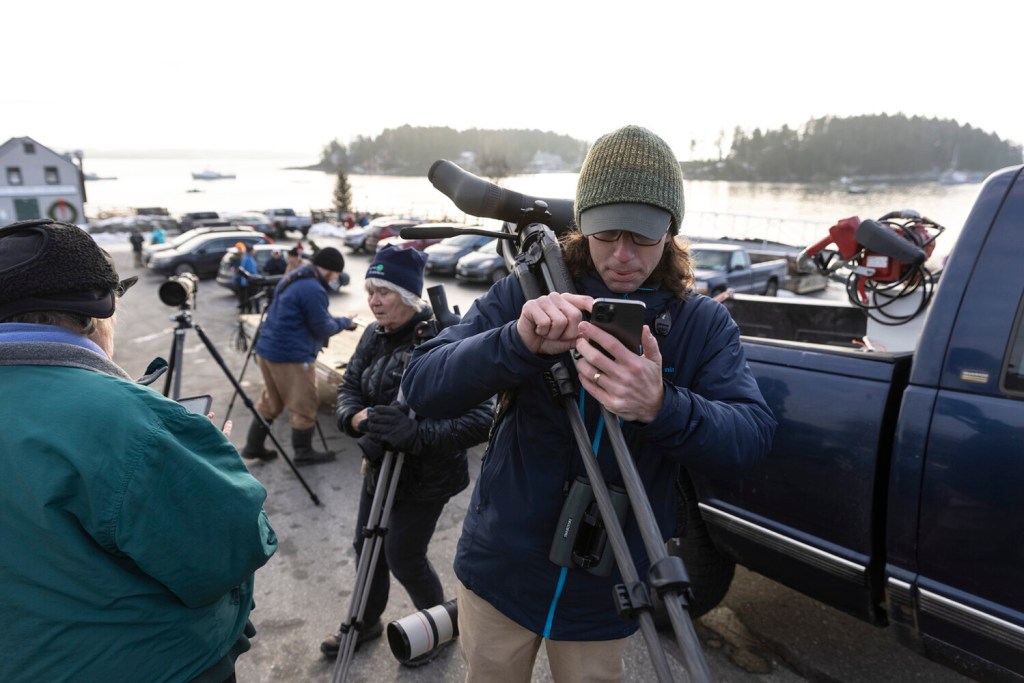“I was maybe just hoping it would come up here. Then I saw on social media last night it was here. So we got up this morning,” said Carlie Lochner of Sabattus, who brought her two children, ages 3 and 6 and both birders. “They are here for the birding. And they have their own binos.”