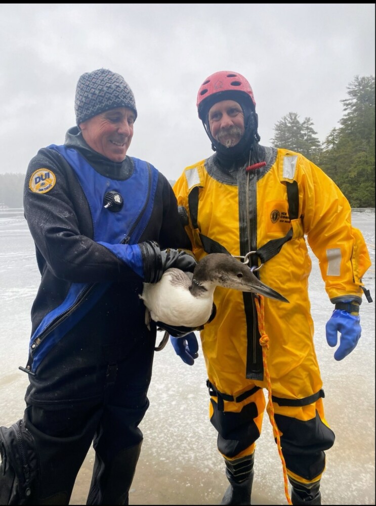 Fire Chief Dan Roy said such a rescue was “unique,” happening when a bird becomes trapped in open water that is surrounded by ice. A loon typically needs at least 100 feet for a “runway,” and since the bird was iced in, it did not have room to take off.