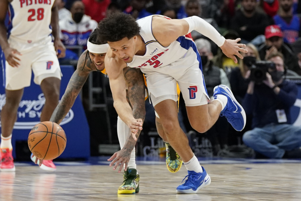 Jazz guard Jordan Clarkson and Pistons guard Cade Cunningham chase a loose ball during the Pistons’ 126-116 win Monday in Detroit. Carlos Osorio/Associated Press