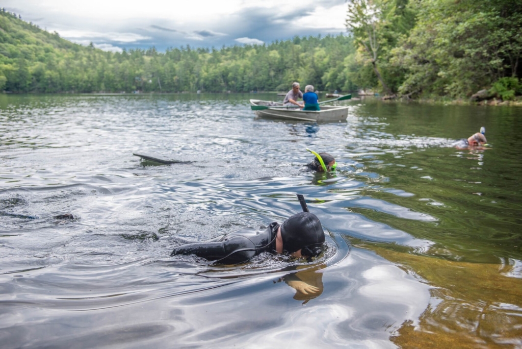 Divers and snorkelers comb the bottom of Cushman Pond in Lovell last summer to verify that milfoil was gone. Removal of the invasive weed is a painstaking process and it is rare that milfoil is completely eradicated from a body of water once introduced, a state biologist said. Andree Kehn/Sun Journal file