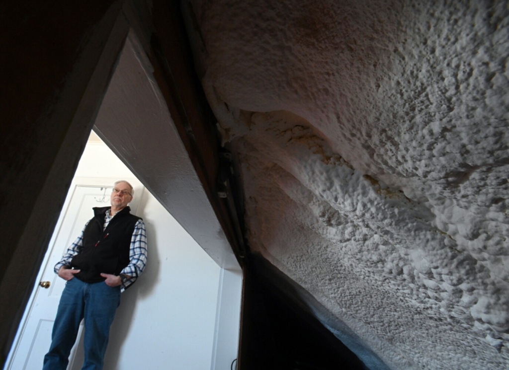 Steve Kahl stands near the expanding foam insulation he had installed in the attic crawl space of his Waterville home. He also installed insulation on the walls of his basement. The insulation has helped increase the overall energy efficiency of his home. Kahl also uses heat pumps and is enrolled in a community solar program. Rich Abrahamson/Morning Sentinel