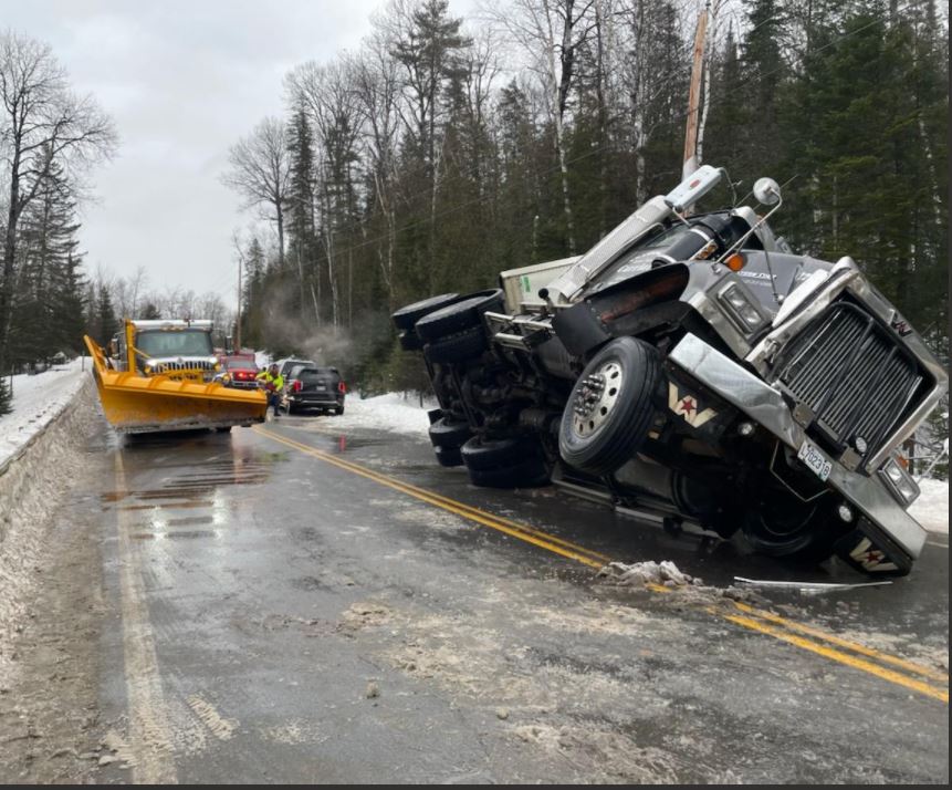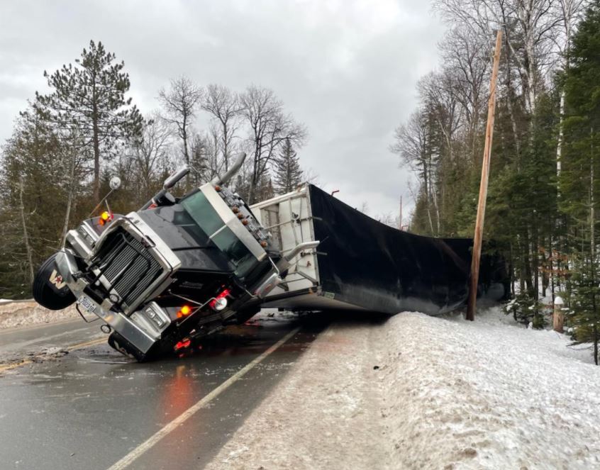 A Canadian tractor-trailer loaded with wood chips lies on its side Thursday morning along Route 27 in Jim Pond Township in northern Franklin County. The road was a sheet of ice at the time, officials said. Eustis Fire Rescue photo