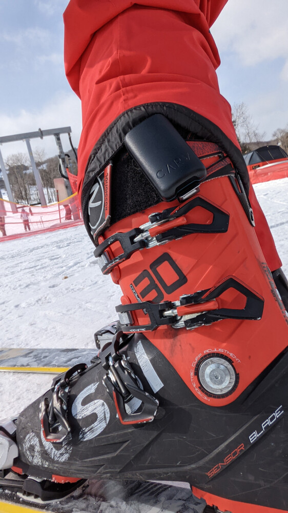 Installation wasn’t too different from a typical footbed, beyond the fact that Carv’s sensors fit between the liner and boot shell, rather than directly underfoot. Gaffer tape runs a cable up to the cuff of the boot, where you clip on a battery pack with enough juice to power the sensors for three days per charge. All in all, setup took about 10 minutes. Like most Bluetooth, I found pairing the sensors to my phone a bit touchier, but any issues were solved with the old standby move of unplugging everything then plugging it back in.